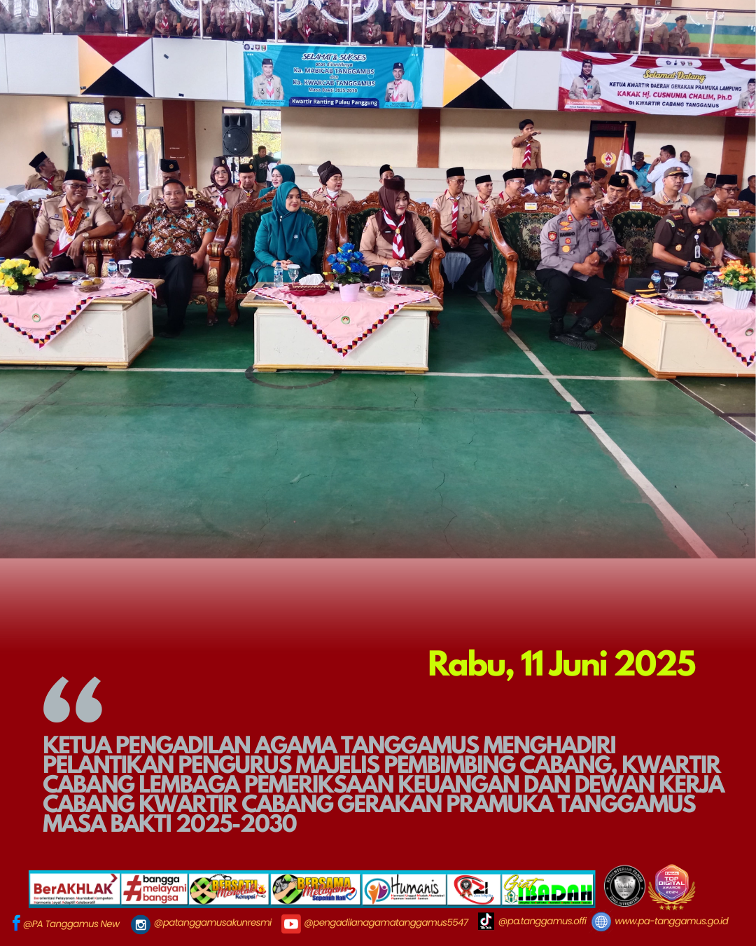 Ketua Pengadilan Agama Tanggamus, Ibrahim Lubis, S.H.I., M.H., menghadiri Pelantikan Pengurus Majelis Pembimbing Cabang, Kwartir Cabang, Lembaga Pemeriksa Keuangan, dan Dewan Kerja Cabang Gerakan Pramuka Tanggamus masa bakti 2025–2030, yang dilaksanakan di GOR Ratu Waysom, Wonosobo, Kabupaten Tanggamus.