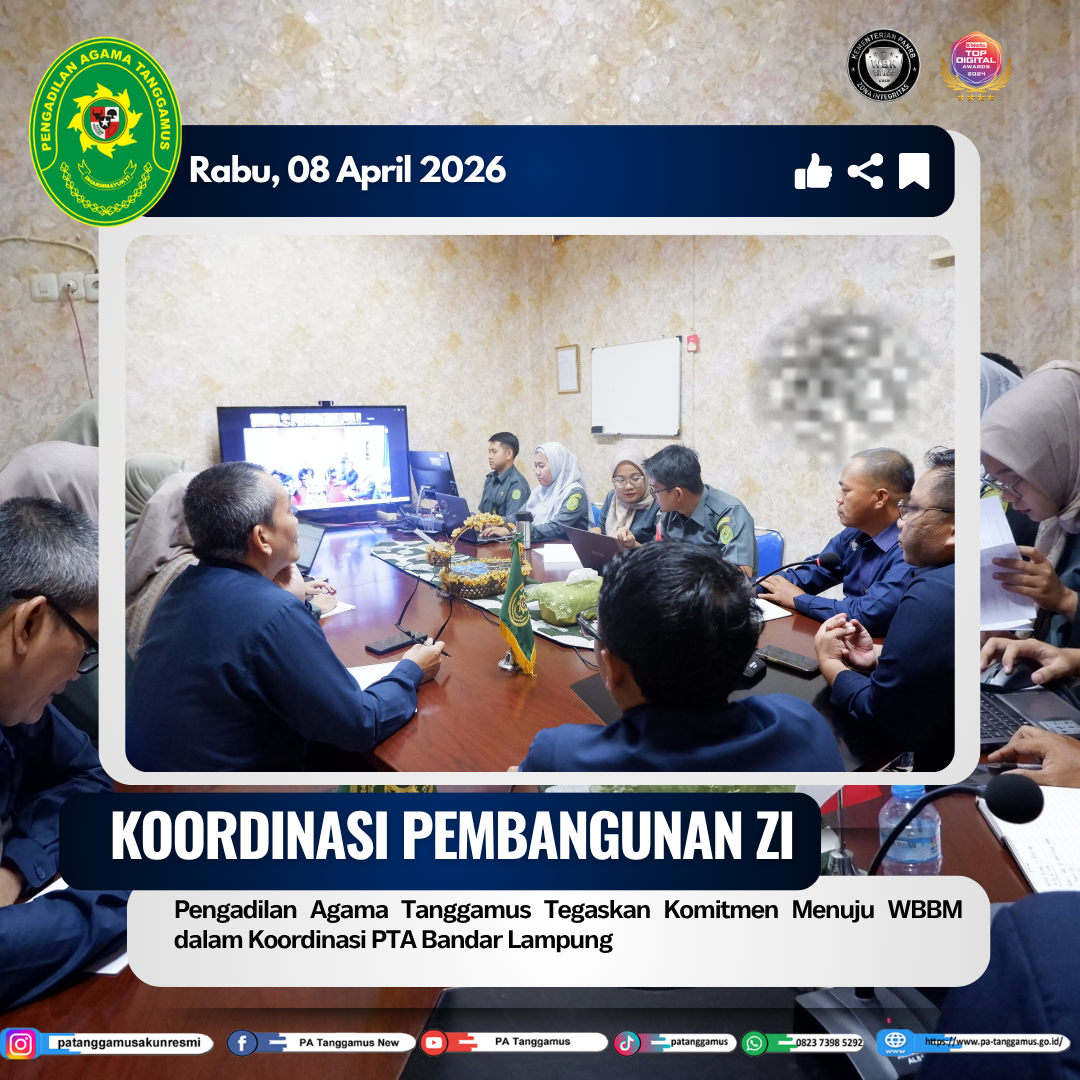 Pengadilan Agama Tanggamus menunjukkan komitmen kuat dalam mewujudkan tata kelola pemerintahan yang bersih dan melayani dengan mengikuti kegiatan koordinasi pembangunan Zona Integritas yang diselenggarakan oleh Pengadilan Tinggi Agama (PTA) Bandar Lampung secara daring. Kegiatan ini menjadi bagian penting dalam persiapan satuan kerja menuju predikat Wilayah Bebas dari Korupsi (WBK) serta Wilayah Birokrasi Bersih dan Melayani (WBBM). (07/04/2026)