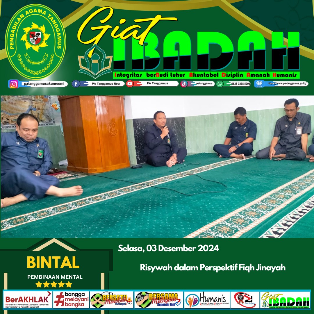 Tanggamus, 3 Desember 2024 – Pengadilan Agama Tanggamus hari ini menyelenggarakan kegiatan Bina Mental yang diisi oleh Ketua Pengadilan Agama Tanggamus, Bapak Ibrahim Lubis, S.H., M.H. Kegiatan yang bertema "Risywah (Suap) dalam Perspektif Fiqih Jinayah" ini bertempat di Musolla Al-Mahkamah Pengadilan Agama Tanggamus dan dihadiri oleh seluruh warga pengadilan.