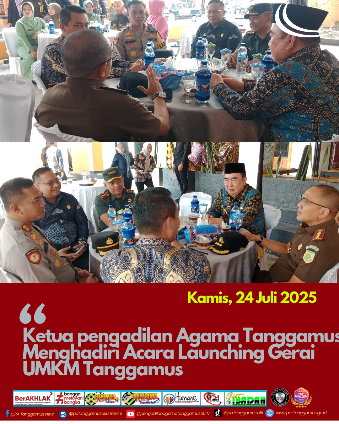 Ketua Pengadilan Agama Tanggamus, Ibrahim Lubis, S.H.I., M.H., menghadiri acara Launching Gerai UMKM Tanggamus yang berlangsung meriah di Rest Area Gisting, pada hari ini. Kegiatan ini merupakan bentuk dukungan nyata terhadap penguatan ekonomi kerakyatan melalui pengembangan Usaha Mikro, Kecil, dan Menengah (UMKM) di Kabupaten Tanggamus.